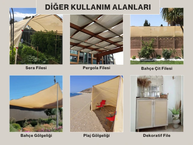 File Yoğunluğu: Bu krem havuz gölgeliği %95 sıklıkta dokunmuştur. Tam gölge arayanlar için idealdir. Daha geçirgen bir çözüm isteyenler için ise %75’lik 65 gram file önerilebilir.